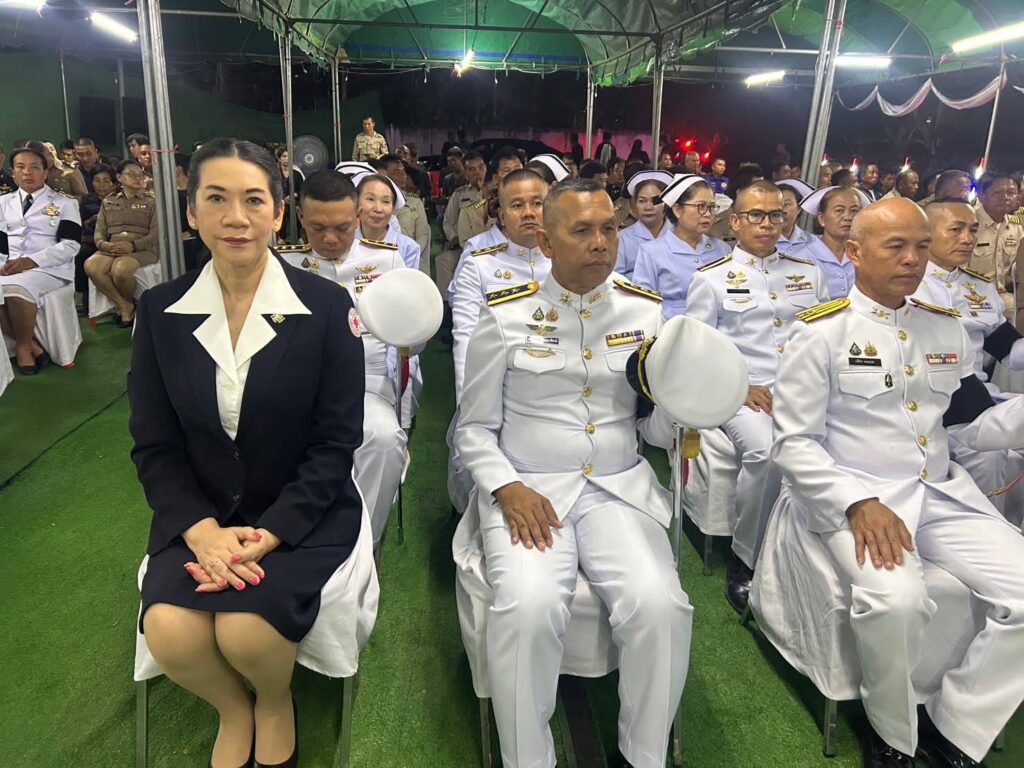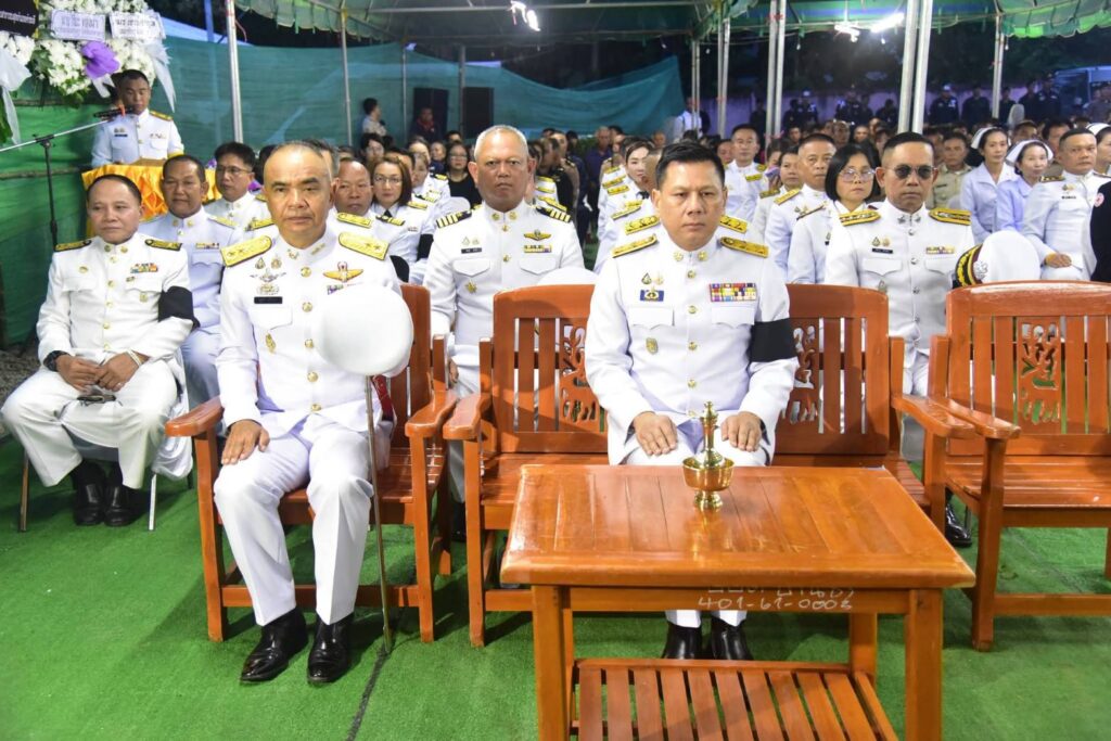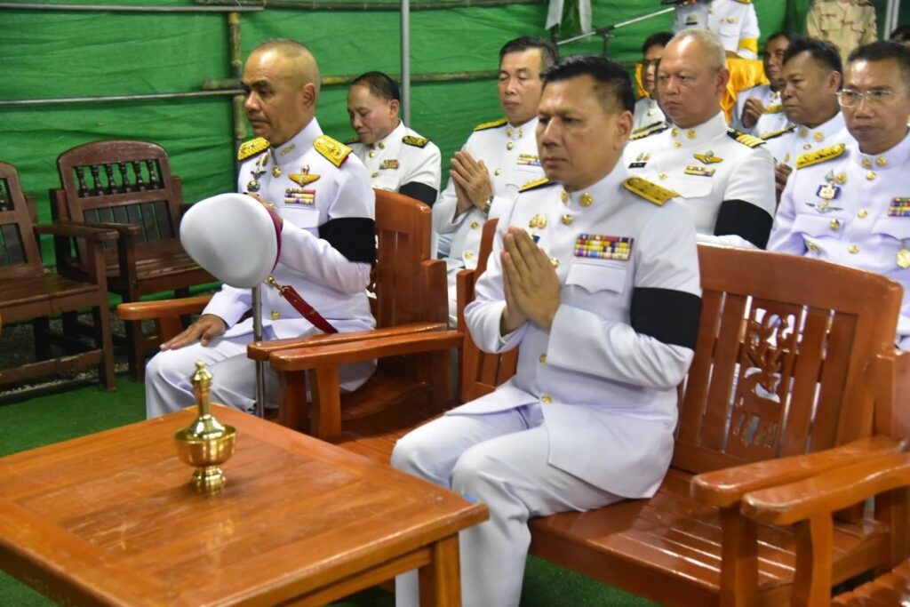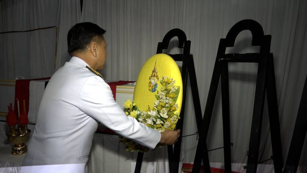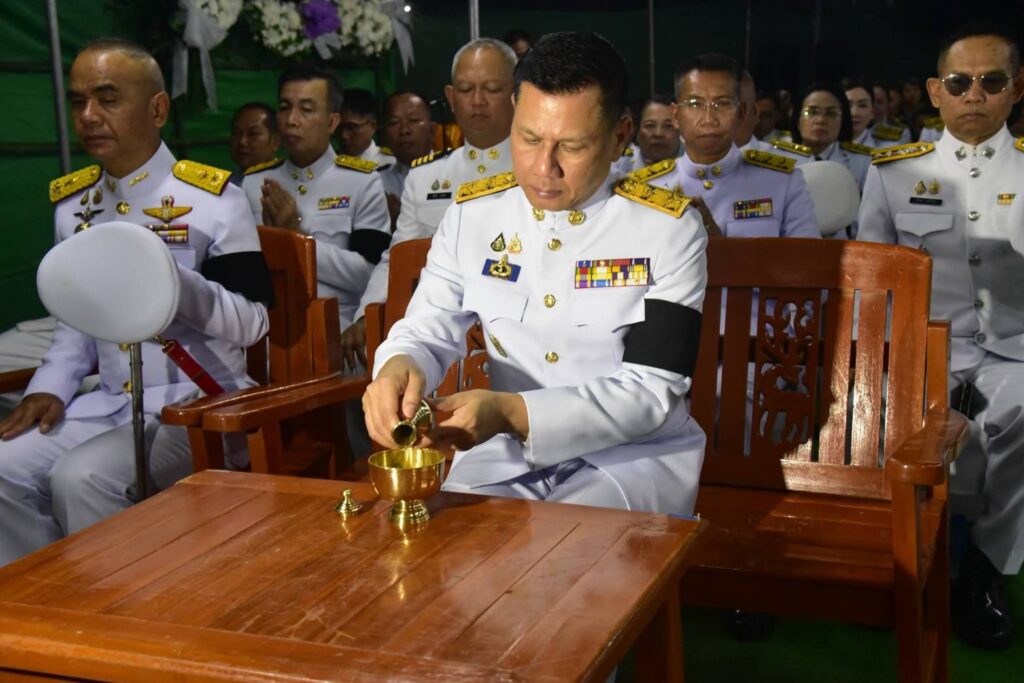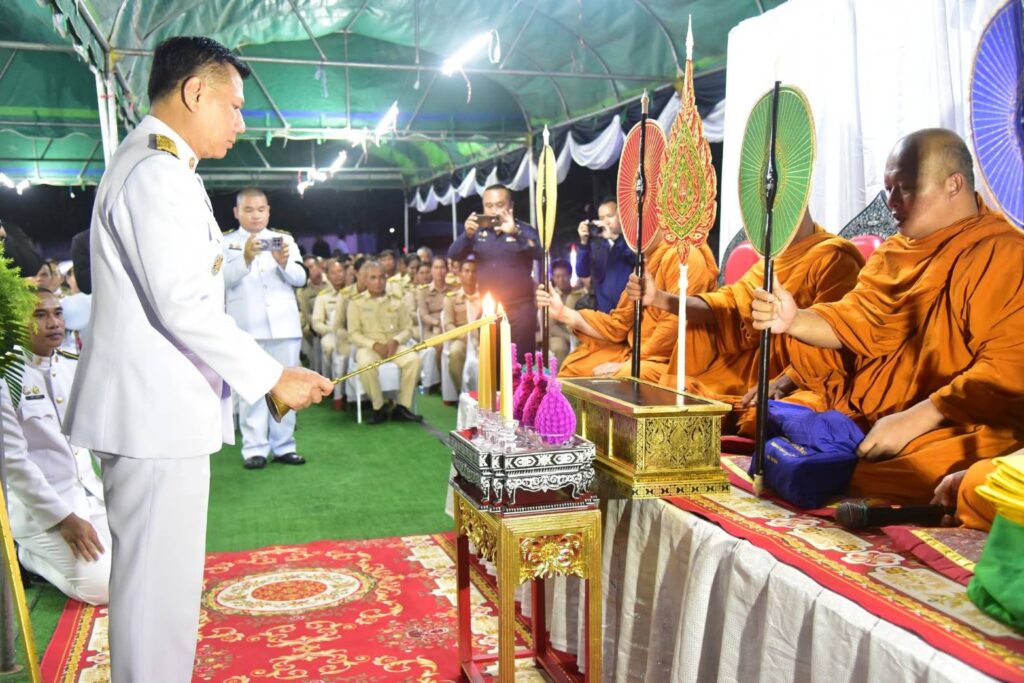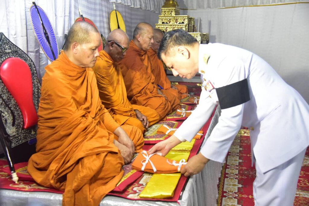 พระพิธีธรรมจากวัดศรีมงคลใต้ พระอารามหลวงขึ้นสู่อาสน์สงฆ์เจ้าหน้าที่อัญเชิญพวงมาลาพระราชทานเข้าสู่พิธี