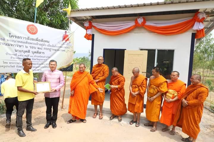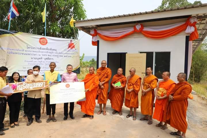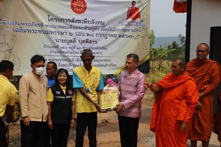 ผู้ว่าราชการจังหวัดมุกดาหาร พร้อมด้วยพระราชรัตนโมลี เจ้าคณะจังหวัดมุกดาหาร พระวิฑูรวชิรโมลี รองเข้าคณะจังหวัดมุกดาหารพร้อมด้วยคณะสงฆ์ นายอำเภอนิคมคำสร้อย ส่วนราชการ ผู้นำชุมชน ร่วมมอบบ้านตามโครงการสังฆเพื่อสังคม ให้กับ นายบุดดี บุดดีสาร ซึ่งเป็นกลุ่มเปราะบาง ในพื้นที่ อำเภอนิคมคำสร้อย จังหวัดมุกดาหาร