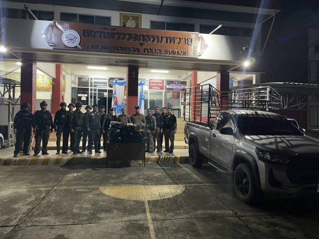• เมื่อ 16 พ.ย.67 เวลา 2130 บก.ผาดง ฉก.ไชยานุภาพ ได้รับการประสานจาก จนท.ตร.สภ.นาหวาย ว่ามีรถยนต์ต้องสงสัยเป็นกระบะ ยี่ห้อโตโยต้า รีโว่ ตอนเดียวแบบมีคอก สีบรอนซ์เทา หมายเลขทะเบียน ยต 6948 เชียงใหม่ ไม่ยอมหยุดรถให้ตรวจบริเวณจุดตรวจ/จุดสกัดกั้น ชั่วคราวหน้า สภ.นาหวาย มุ่งหน้าไปทาง บ.แม่กอนใน ต.ทุ่งข้าวพวง อ.เชียงดาว จ.เชียงใหม่ หน่วยจึงจัด กพ.1 ชป. ร่วมทำการสกัดกั้นและไล่ติดตาม รถคันดังกล่าวจนมาถึง บริเวณพื้นที่ป่าบริเวณ บ.ใหม่พัฒนา บ้านบริวาร บ.แม่กอนใน พิกัด MB 917656 ต.ทุ่งข้าวพวง อ.เชียงดาว จว.ช.ม. ( ห่างจากฐานฯ ห้วยเป้า ระยะทางประมาณ 5 กม.) ผู้ต้องสงสัยได้จอดรถและวิ่งหลบหนีเข้าไปในป่าโดยอาศัยความมืด ชป.ร่วมกับ ตร.สภ.นาหวาย ได้ไล่ติดตามแต่ไม่พบตัวผู้ต้องสงสัย จากการเข้าควบคุมพื้นที่ และตรวจสอบภายในรถ พบยาเสพติดให้โทษประเภท 1 (ยาไอซ์) จำนวน 9 กระสอบ รวมน้ำหนักประมาณ 110 กิโลกรัม ปัจจุบัน จนท.ตร.ได้นำ รถยนต์และของกลางไปยัง สภ.นาหวาย เพื่อดำเนินการตามกฎหมายต่อไป..