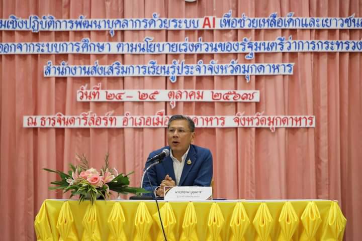 ผู้ว่าราชการจังหวัดมุกดาหาร ประธาณเปิดโครงการอบรมเชิงปฏิบัติการพัฒนาบุคลากรด้วยระบบ AI เพื่อช่วยเหลือเด็กและเยาวชนอายุ 6-18 ปี ที่หลุดออกจากการศึกษา ตามนโยบายเร่งด่วนของรัฐมนตรีว่าการกระทรวงศึกษาธิการ ระหว่างวันที่ 24-25 ตุลาคม 2567 ณ